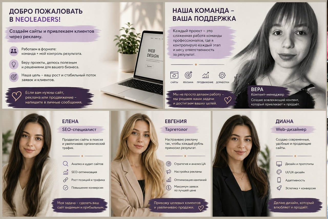 Проект ведет сертифицированный эксперт. Техническую часть выполняют талантливые ученики под моим строгим контролем. Это гарантирует качество студии по цене фриланса.
